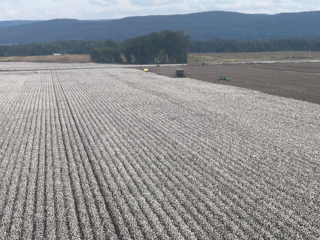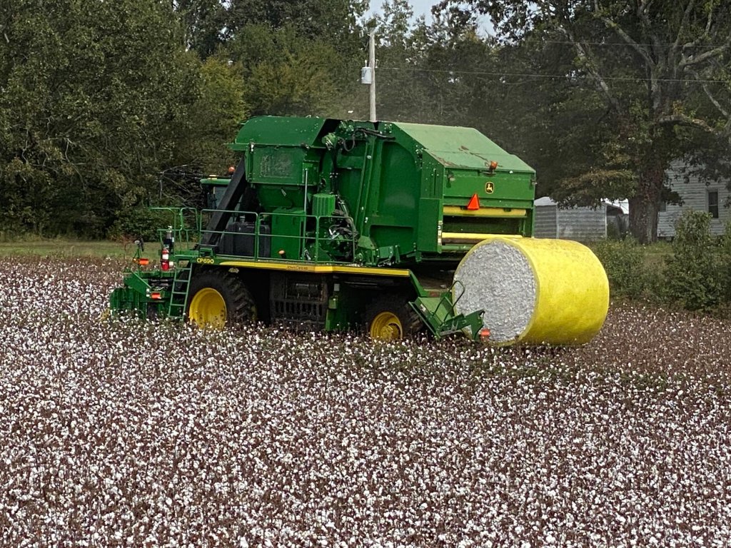 Open bolls signal the cotton crop is ready for harvest. This can happen any time from mid-July to October depending on where it’s planted. The majority of cotton is harvested using machine pickers that remove the bolls from plant stocks. The harvested cotton is then placed in large round bales or square modules and transported to a gin for processing.